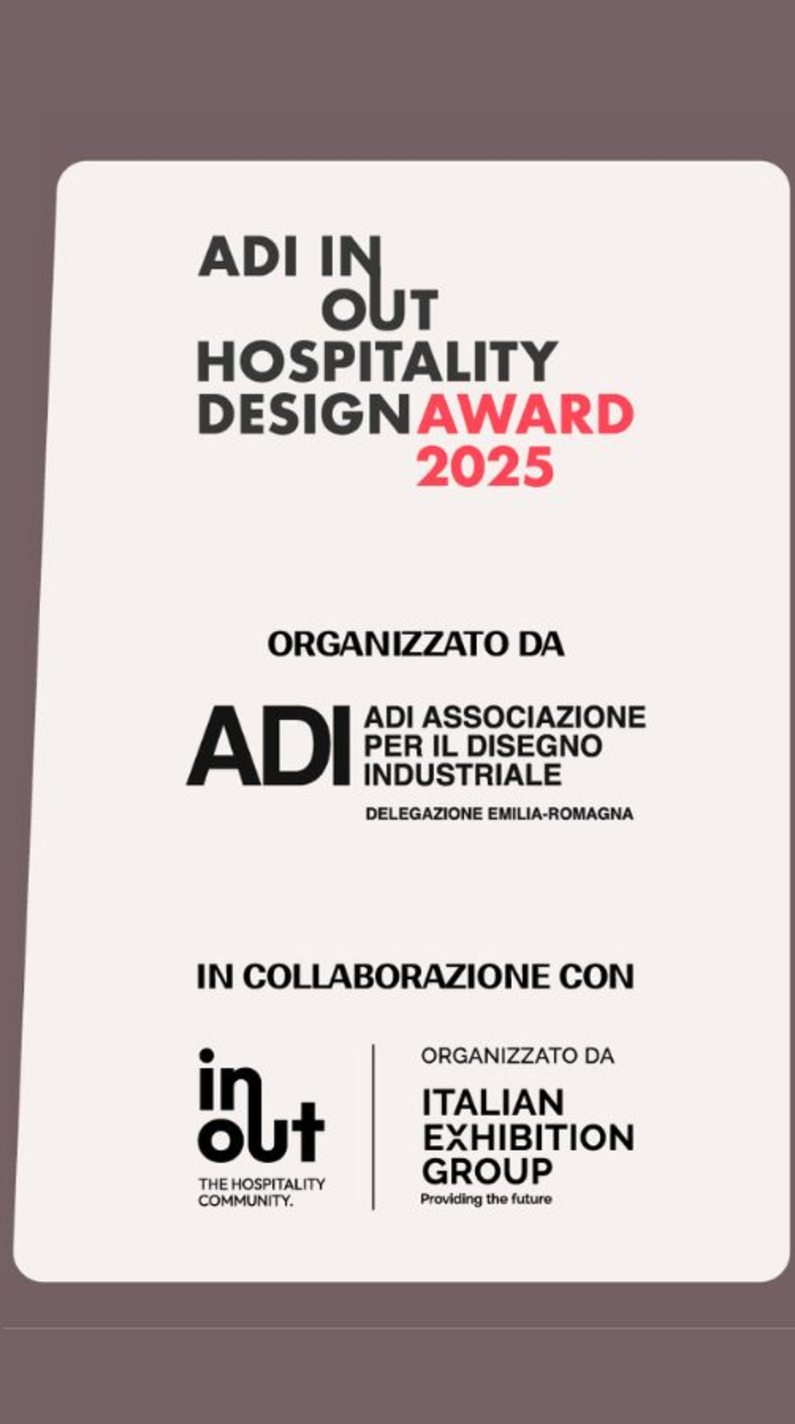 Il Premio ADI InOut Hospitality Design Award assicurerà il superamento della prima fase di selezione condotta dagli osservatori delle delegazioni territoriali per l'ADI Design Index 2025, che rappresenta la selezione del miglior design italiano e la preselezione per il XXIX Compasso d’Oro.